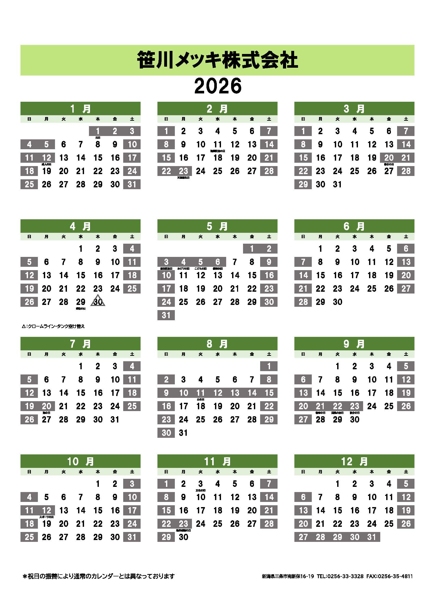 2026年 営業日のお知らせ 平素は格別のご高配を賜り、厚く御礼申し上げます。 来年の営業日カレンダーが出来上がりました。 *祝日が営業日になり、その代わりに平日が休業日になっている日がございますので、ご注意ください。2026 企業向けカレンダー